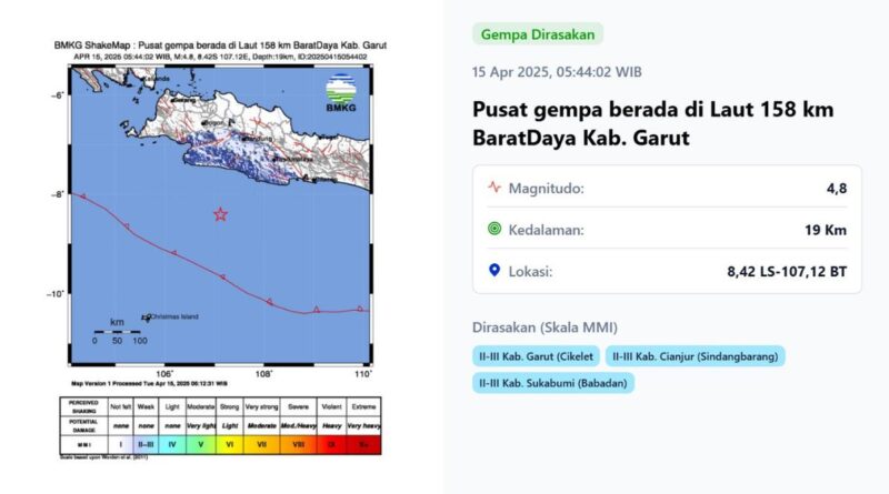 Lalu 05:44:02 Gempa Bumi terjadi di Garut Regency of West Java. Lindu memiliki ukuran 4,8 dengan kedalaman 19 km.