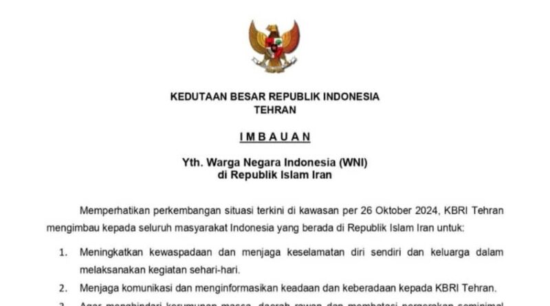Mengingat situasi kawasan per 26 Oktober 2024, KBRI Teheran telah mengeluarkan permohonan kepada seluruh WNI yang berdomisili di Republik Islam Iran.