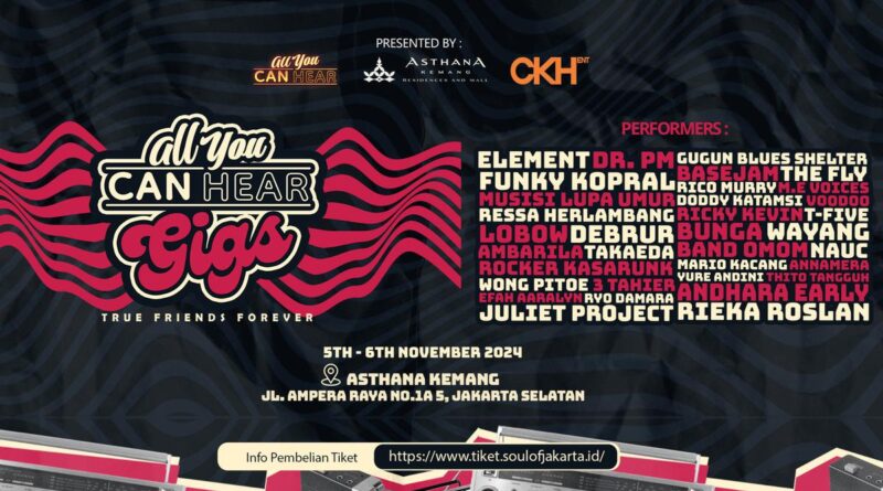 Liputan6.com, Jakarta Acara musik yang paling ditunggu-tunggu tahun ini, “All You Can Here Gigs 2024”, akan segera hadir di Jakarta! Acara yang digadang-gadang sebagai ‘Gig of the Year’ ini akan berlangsung pada 5 hingga 6 November 2024 di Astana, Kemang, Jakarta Selatan.